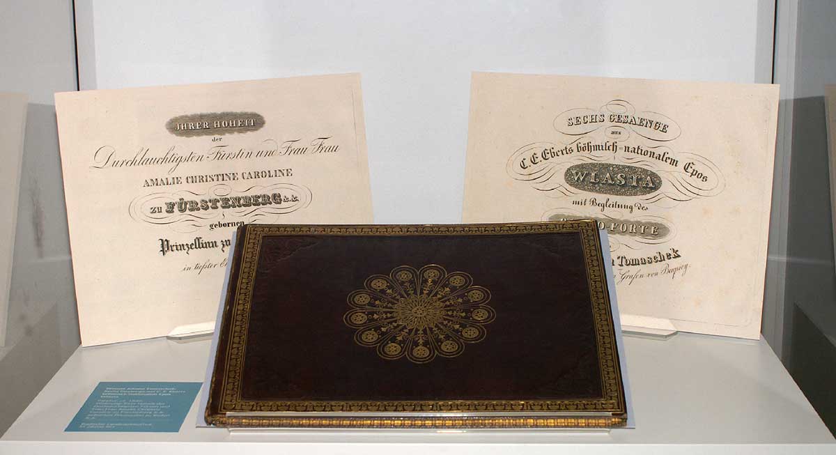 Als Ergänzung für die aus der Fürstlich Fürstenbergischen Hofbibliothek stammende Donaueschinger Musiksammlung, die seit 1999 in der Badischen Landesbibliothek aufbewahrt wird, konnte der Musikdruck Sechs Gesaenge aus C. E. Eberts böhmisch-nationalem Epos Wlasta des österreichisch-böhmischen Komponisten Wenzel Johann Tomaschek (1774–1850) erworben werden. Das Haus Fürstenberg hatte große Besitzungen in den österreichischen Erblanden inne – besonders in Böhmen. Der Musikdruck entstand um 1836 und enthält eine Widmung an Amalie Christine Caroline zu Fürstenberg (1795–1869), geborene Prinzessin von Baden. Er ist mit einem wertvollen pflaumenfarbenen Maroquin-Einband versehen, der mit exquisiten Blindprägungen und Vergoldungen geschmückt ist.