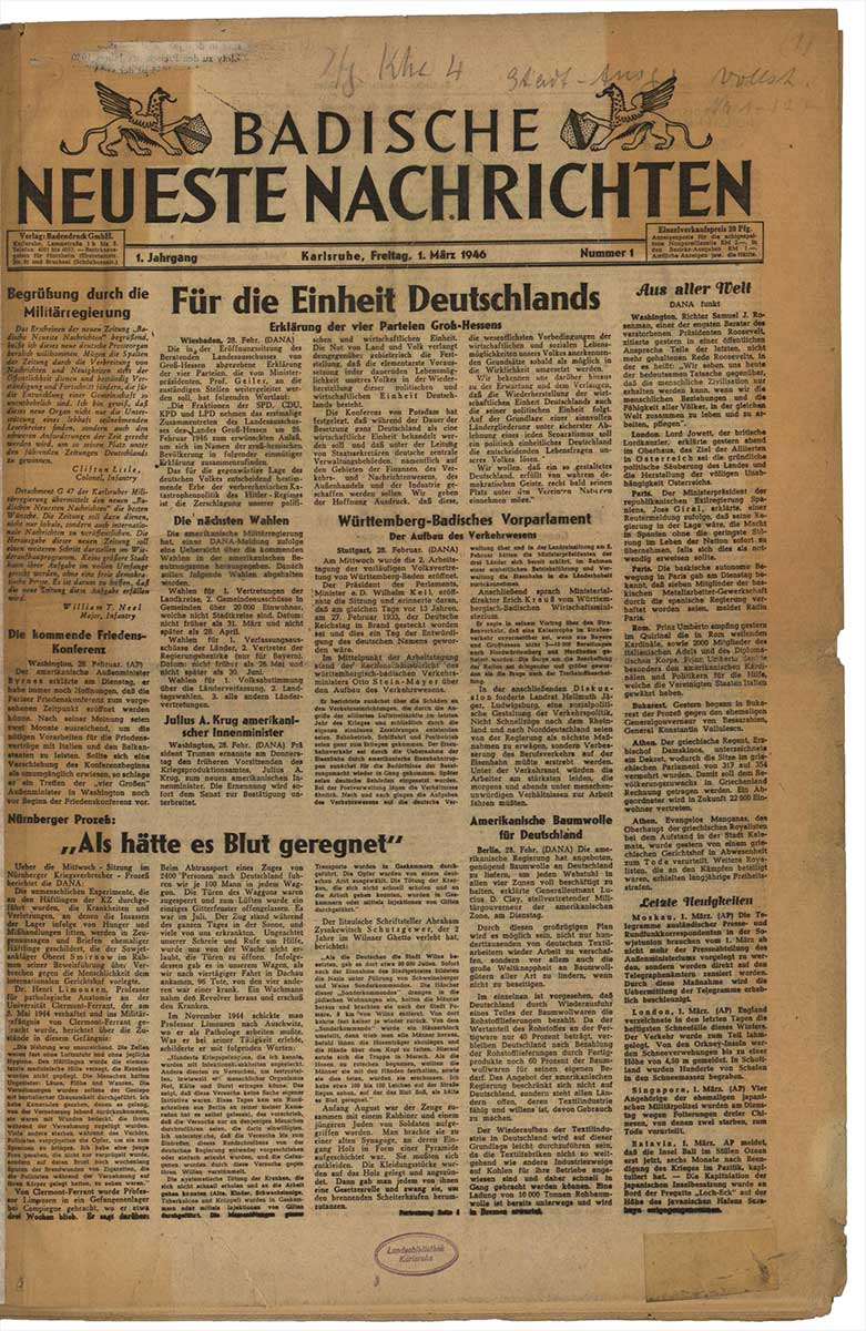 Zu Beginn des ersten Lokalteils der Badischen Neuesten Nachrichten vom 1. März 1946 findet sich die Aussage, dass auf den folgenden Seiten das für „Karlsruhe und seine Umgebung bedeutsame politische und wirtschaftliche Ereignis diskutiert“ und ein Fokus auf den „Karlsruher Begebenheiten“ liegen werde. Zeitungen sind nicht nur eine spannende Quelle für die Zeitgeschichte und verschiedene Fragestellungen von der Politik über die Wirtschafts-, Sozial- und Kulturgeschichte bis hin zur Alltagsgeschichte, sondern auch für die Landes- und Regionalgeschichte. Die Badische Landesbibliothek hat deshalb eine Reihe badischer Presseerzeugnisse aus den vergangenen drei Jahrhunderten digitalisiert. Die Titel erstrecken sich von der Mitte des 18. Jahrhunderts bis 1950. Es handelt sich um Tages- und Wochenzeitungen aus der Region, die das politische Meinungsspektrum der Zeit abbilden.