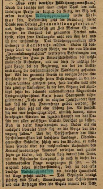 Am 16. September 1893 konnte im Gebäude der Volksschule in der Waldstraße 83 das erste Mädchengymnasium Deutschlands in einem feierlichen Festakt eröffnet werden. Bereits im Vorfeld wurde ausführlich über die Ziele, die Ausrichtung und den Lehrplan des Mädchengymnasiums berichtet, wie zum Beispiel in der Karlsruher Zeitung am 13. August 1893. Auch teilte der Verein mit, dass „zur dankbaren Erinnerung an die vorurteilsfreie Aufnahme seiner Schule seitens der Stadt“ zehn kostenfreie Plätze für Mädchen eingerichtet werden, die gebürtig aus Karlsruhe stammen oder mindestens vier Jahre eine Karlsruher höhere Schule besucht haben – wie man am 27. August 1893 dem Karlsruher Tagblatt entnehmen konnte. Die eigentliche Eröffnung war den meisten Zeitungen dann nur mehr eine kürzere Notiz wert, wie der Landbote am 21. September 1893 zeigt: