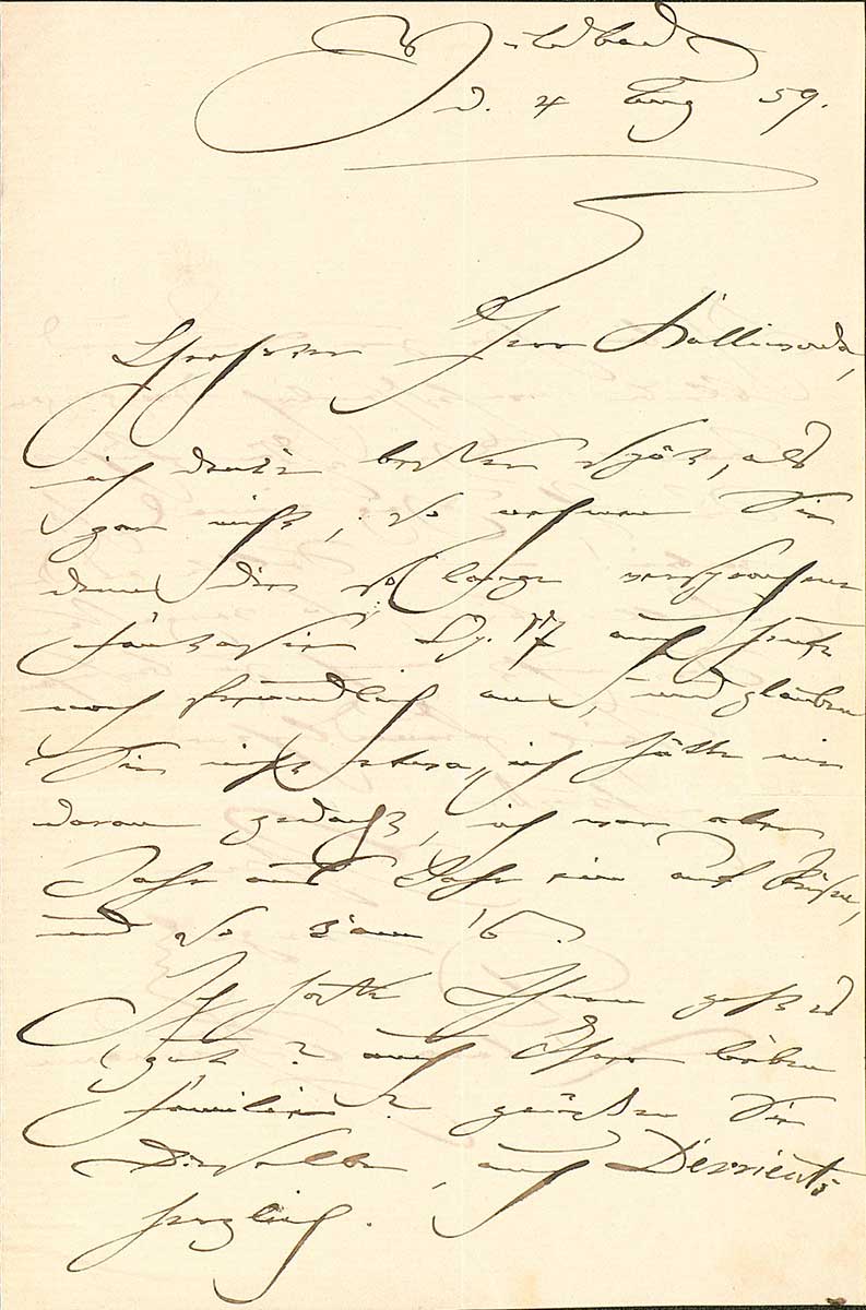 „Geehrtester Herr Kalliwoda, so eben empfange ich Ihre freundlichen Zeilen und beeile mich Ihnen augenblicklich zu antworten. Der 15te (Freitag Abend) ist der einzige, wo es möglich ist, daß ich komme, [...]. [Ich] komme Abends 8 Uhr nach Stuttgart und Freitag Morgen nach Karlsruhe. Ich muß nun wieder wie im vorigen Jahr alles Ihnen aufbürden, was mir wahrhaft leid thut. [...] Ich schicke Ihnen aber Programm und Billets [sic], damit es an mir nicht fehle, soll das Concert bei’m 15ten bleiben.“ (Badische Landesbibliothek K 3172, 14)