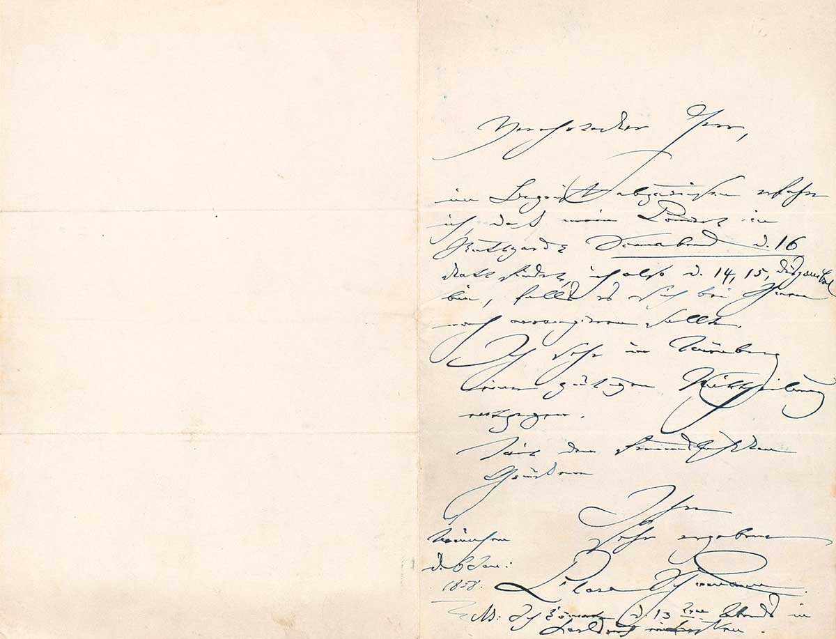 „Geehrter Herr, erst heute Abend ist mir Herrn Eduard Devrient’s Schreiben zugekommen, woraus ich ersah, daß Sie Sich freundlichst betreffs einer Soiree für mich bemühen wollen. [...] Hiebei sende ich Ihnen das Programm – Sie ersehen daraus, daß ich nur zweier Gesangsnummern bedarf. Wollen Sie mir nun gütigst mittheilen, ob ich Ihnen Billette schicken soll, wie Viele, ob eine oder zwei Sorten, und ob ich ein schönes Klavier in Karlsruhe finden würde? ist dies nicht der Fall, so bringe ich Eines, welches ich von Düsseldorf hieher kommen ließ, mit. Wegen der Gesangsnummern meinte ich Herrn Devrient würde es keine Schwierigkeiten machen.“ (Badische Landesbibliothek K 3172, 12. Hervorhebung im Original)