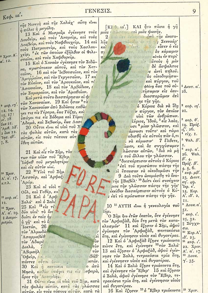 Neugriechische Bibel aus dem Besitz von Andreas von Griechenland mit dem von seinen Töchtern gestalteten Lesezeichen „FORE PAPA“. Signatur: 98 B 104090