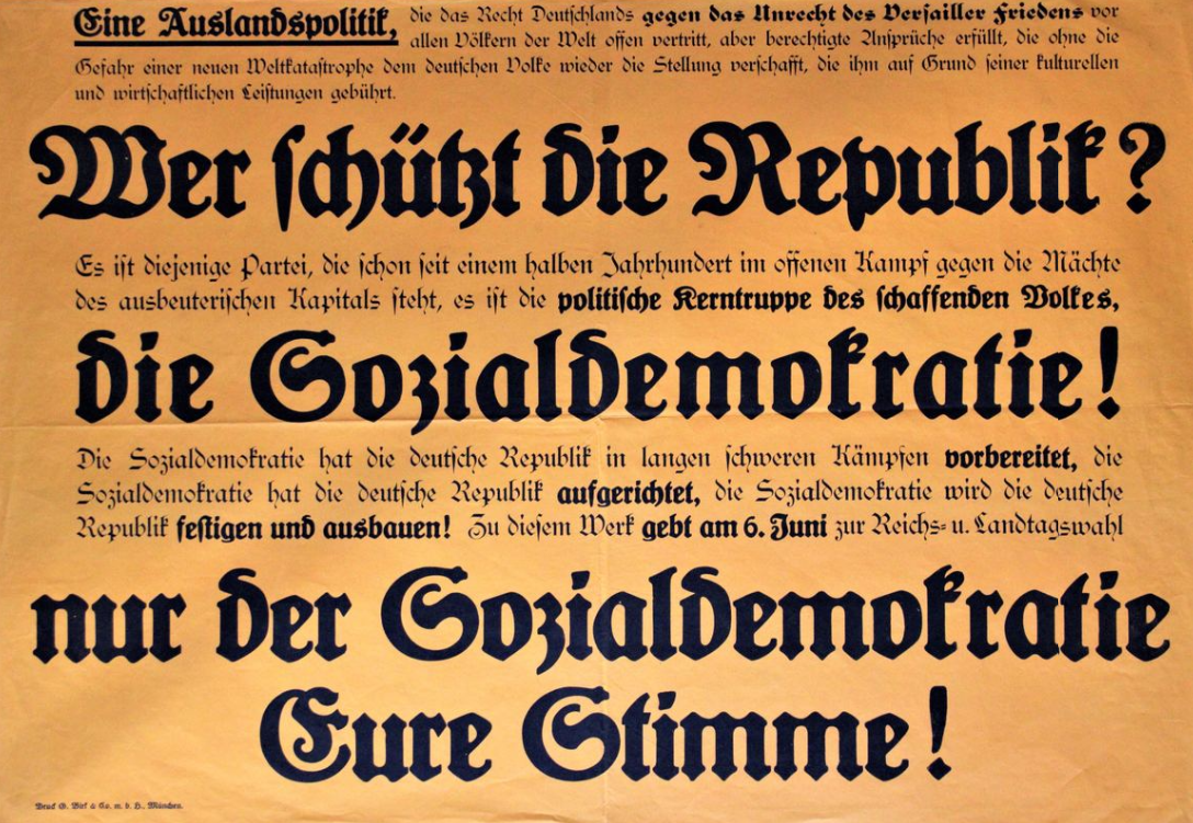 Abb. 4: Plakat „Wer schützt die Republik?“ der SPD zur Reichstagswahl am 6. Juni 1920, Quelle: Stiftung Reichspräsident-Friedrich-Ebert, © CC BY-NC-SA