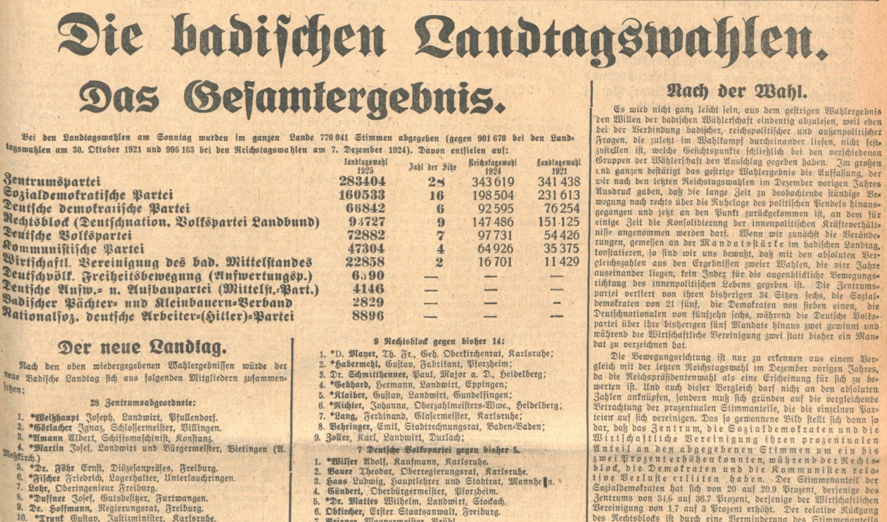 Im März 2026 wird in Baden-Württemberg ein neuer Landtag gewählt – und das in einer sich zunehmend polarisierenden politischen Lage. Vor 100 Jahren wählten die Badener am 25. Oktober 1925 in einer sich ebenfalls immer weiter polarisierenden Lage einen neuen Landtag. Zwar ist die damalige Situation nur schlecht mit der heutigen Lage zu vergleichen – aber gleichwohl lohnt sich ein Blick auf die Rahmenbedingungen, Akteure, Themen und Resultate des damaligen Wahlkampfes. Besonderes Augenmerk wird im Folgenden auf die publizistischen Organe der wahlkämpfenden Parteien von 1925 gelegt.