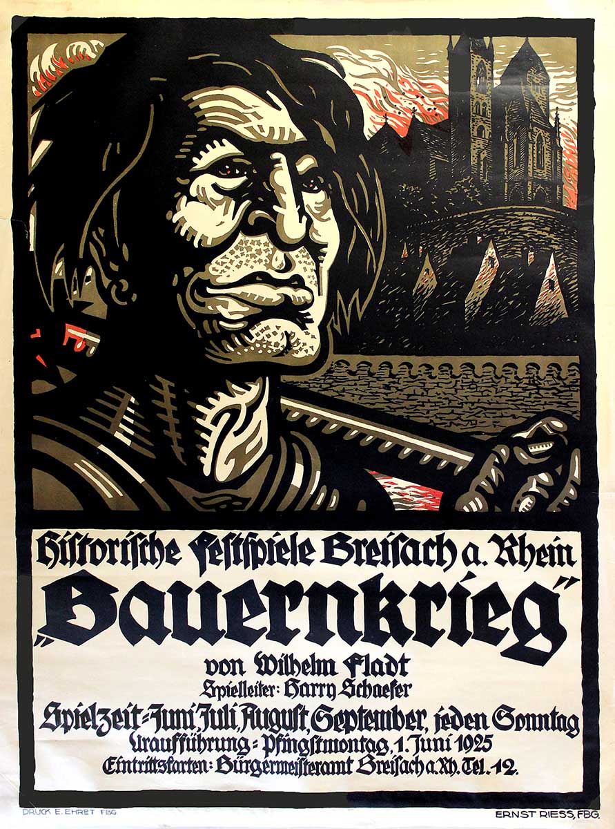 Abb. 2: Plakat zum Bühnenwerk Der Bundschuh von Wilhelm Fladt (1876–1941), das 1925 im Rahmen der Historischen Festspiele Breisach aufgeführt wurde. Der Freiburger Grafiker und Zeichenlehrer Ernst Riess (1884–1962) porträtierte darauf, nach den Worten des Liedermachers Walter Mossmann, den Bundschuhführer Joß Fritz „als eine Art Schwarzwaldindianer, ziemlich wild und exotisch und ziemlich dominant“. (Vorlage und Reproduktion: Stadtarchiv Breisach am Rhein, Historische Plakatsammlung)