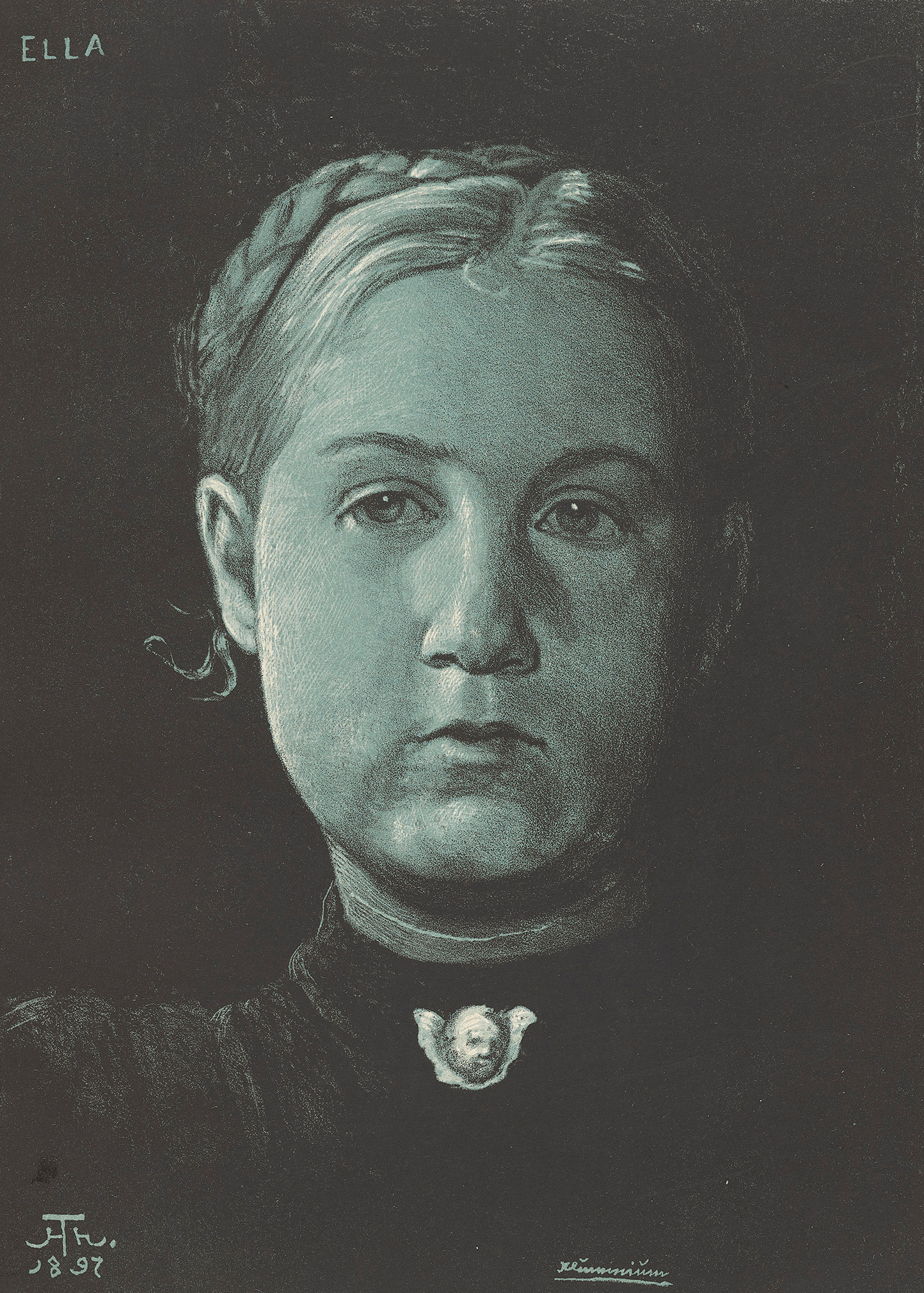 Zu diesen bildlichen Zeugnissen gehört auch eine Algraphie aus dem Jahr 1897, die sich heute im Augustinermuseum Freiburg befindet. Das Blatt zeigt Ella frontal vor dunklem Grund, mit ruhigem, ernstem Ausdruck und ohne jede Staffage. Die Darstellung konzentriert sich vollständig auf Gesicht und Oberkörper und verzichtet auf erzählerische oder situative Hinweise. Dadurch erscheint Ella nicht als Teil einer Handlung, sondern als eigenständige Bildfigur, deren Präsenz allein über Blick, Haltung und physiognomische Ausarbeitung vermittelt wird. Die Algraphie unterstreicht, dass Ella im Werk Hans Thomas nicht nur als familiäres Motiv erscheint, sondern als bewusst gestaltetes Porträt einer eigenständigen Persönlichkeit.