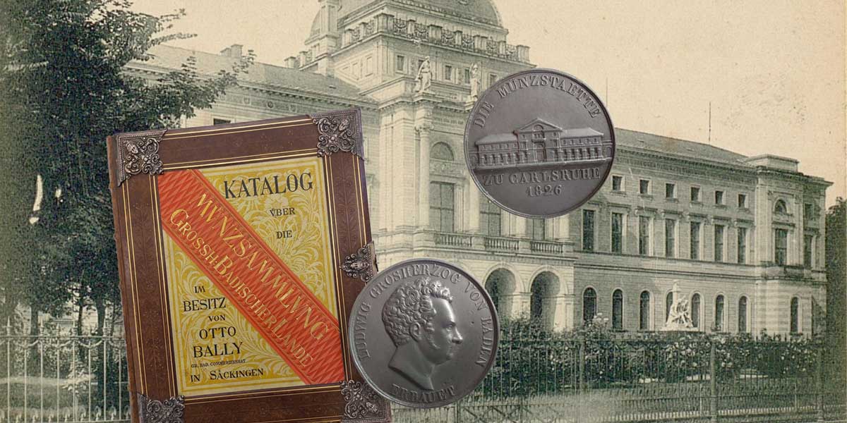 Vorne: Titelseite von Otto Bally: Katalog über die Münzsammlung Grossh. Badischer Lande (Schmuckausgabe, 1896); Bleimedaille auf den Bau der Münzstätte 1826, geprägt von Ludwig Kachel. Im Hintergrund: Sammlungsgebäude auf einer Postkarte (Anfang 20. Jahrhundert).